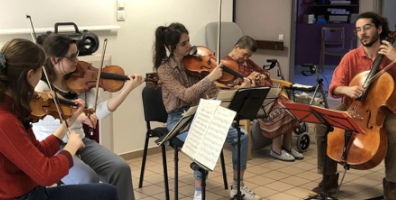 Près de 40 résidents et professionnels ont eu la joie d’écouter le Quatuor Héméra, composé de jeunes artistes lyonnais talentueux. À l’issue du concert les musiciens ont échangé avec le public ; des interactions sensibles, riches et joyeuses.