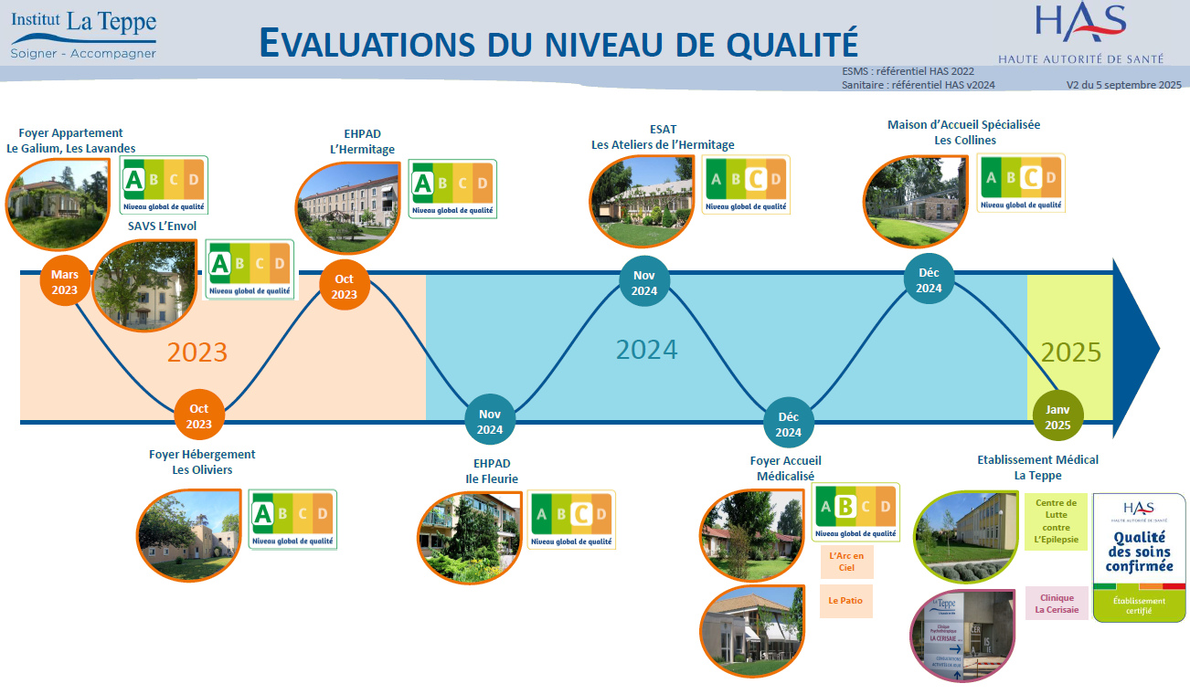 Les 8 Établissements médico-sociaux de la Teppe ont réalisé leurs visites d’évaluation entre 2023 et 2024 :
